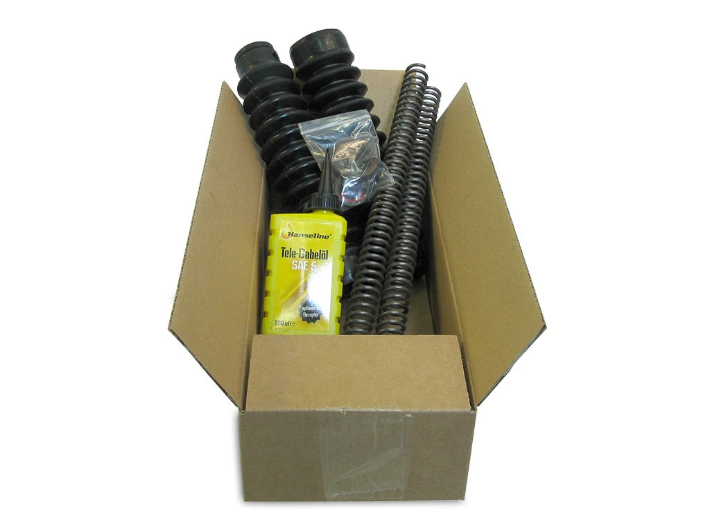 Beschreibung: Es handelt sich bei diesem Artikel um ein Reparaturset komplett mit Faltenbalg im Satz (links und rechts). In diesem Satz sind folgende Kleinteile enthalten: 2x Druckfeder für Vordergabel (Telegabel) mit Ø3,4 verstärkt 2x Faltenbalg in schwarz für Vordergabel 2x Gummi Sicherungsscheibe 5x10x2 Telegabel 2x Sicherungsring 25x1,2 DIN 472 2x Gummi Dichtscheibe 13,5x21x1 Federaufnahme oben 2x Wellendichtring 30x40x7 braun TCK 1x Öl Gabel- und Stoßdämpferöl 0,2 Liter Hanseline