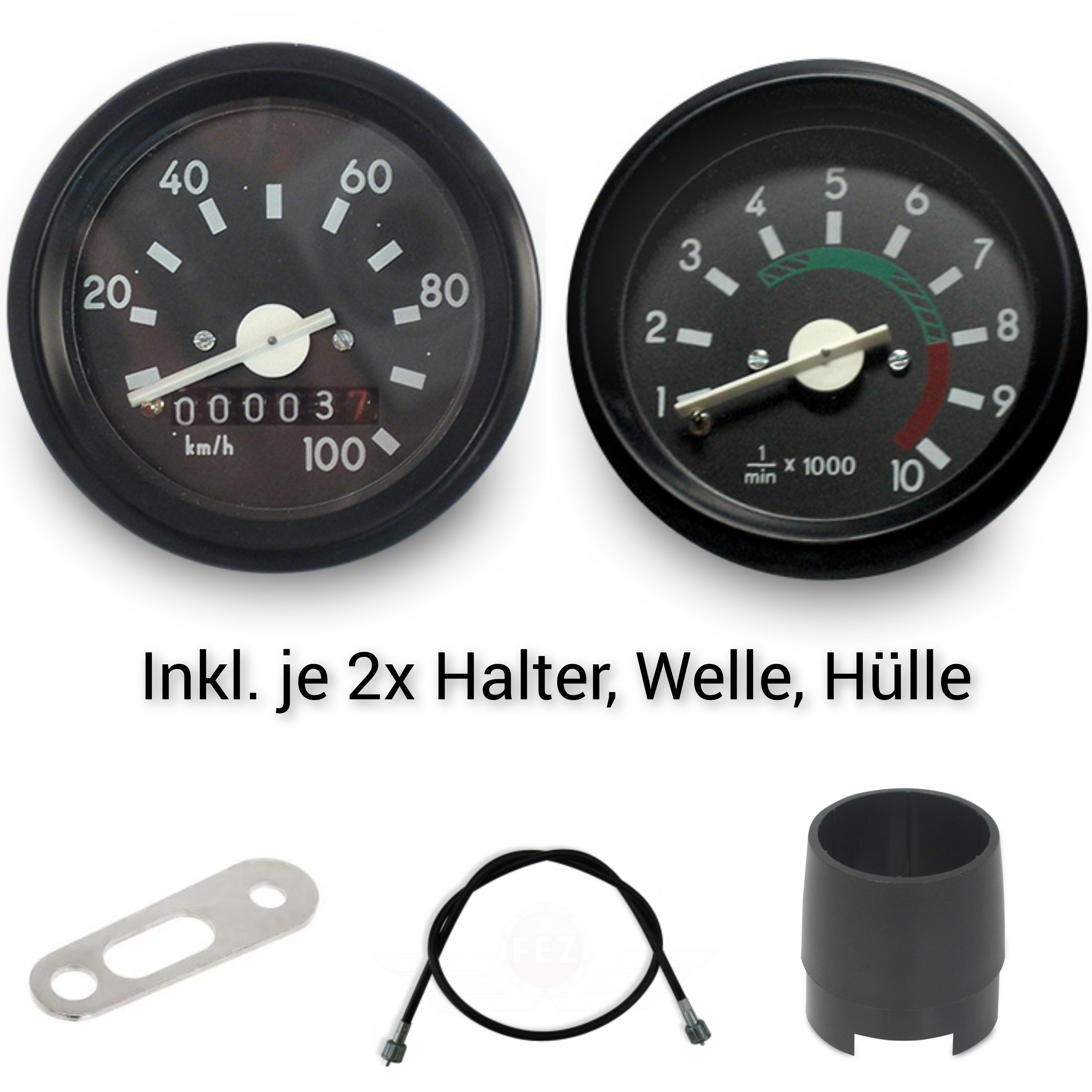 Set - Tacho + Drehzahlmesser- Schwarzer Ring Ausführung- 2 Tacho Hüllen- 1 Drehzahlmesser Welle 700 mm- 1 Tachowelle ca 835mm- 2 Tachohalter einfache Ausführung- Drehzahlmesser ohne Fernlichtkontrolle- Tacho ohne Blinkleuchtenkontrolle- Ohne Leuchtmittel